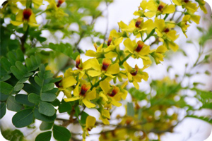 Espécie de árvore com flores de cor amarelo-ouro em forma de cachos, apresenta copa arredondada, tronco e ramos com acúleos, casca pardo-acinzentada ou pardo-rosada nas partes destacadas, cerne vermelho. Atingindo até 30m de altura e 1,5m de circunferência. Sua madeira era utilizada pelos nativos para a confecção de: